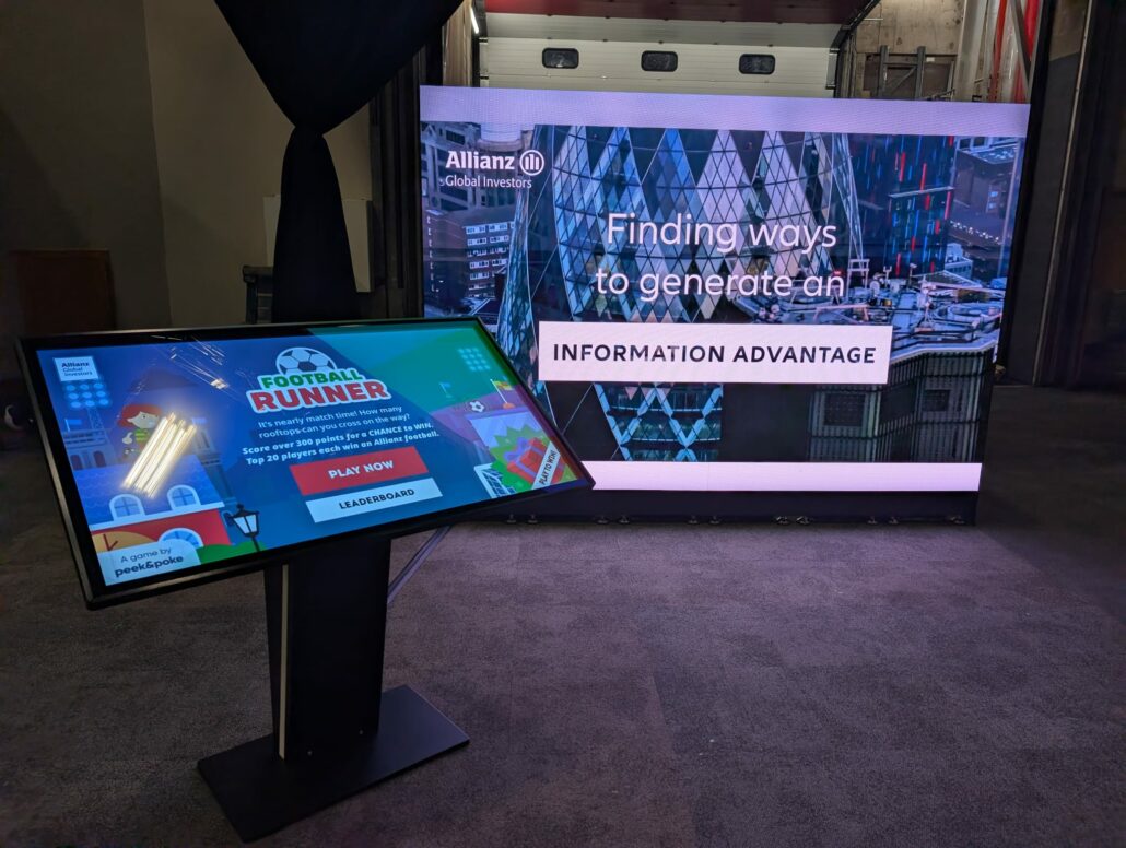 To complement the display and add interactive engagement, Promultis provided a Promultis Allure kiosk featuring an engaging interactive football game, created by peek&poke that attendees could walk up to and play. This combination of striking visuals and playful interaction met Allianz’s objectives of communicating their offering while creating a memorable and fun experience for conference attendees. The game also featured a live scoreboard to encourage competition, with the overall winner receiving a prize to further drive engagement throughout the day.