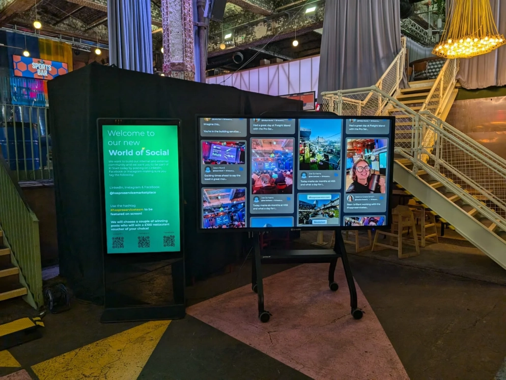 HSS Proservice Marketplace approached us with the goal of creating an interactive digital installation at their event in Manchester, that would engage their employees and gather feedback about what they could do better. They also required a solution that would encourage employees to connect with the company’s social media platforms and share their photos and videos of the day, to then be displayed as part of a social media wall. The installation needed to be eye-catching, accessible, and capable of handling multiple interactive elements, from social media feeds to feedback forms.