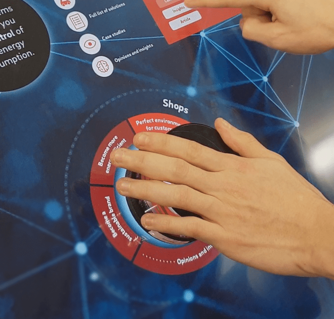 Promultis Object Recognition works with projected capacitive (PCAP) technology. The capacitive touch screen is activated by human touch or, in this case, conductive tags, which serve as a conductor to stimulate the electrostatic field of the touch screen. The object is recognised when the tags interfere with the electric field projected above the surface. This change in capacitance is detected by the controller which interprets the X and Y coordinates of the event.